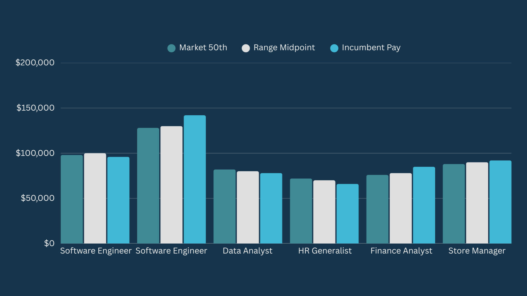 See how your current ranges compare to market medians and where compa-ratios fall—role by role